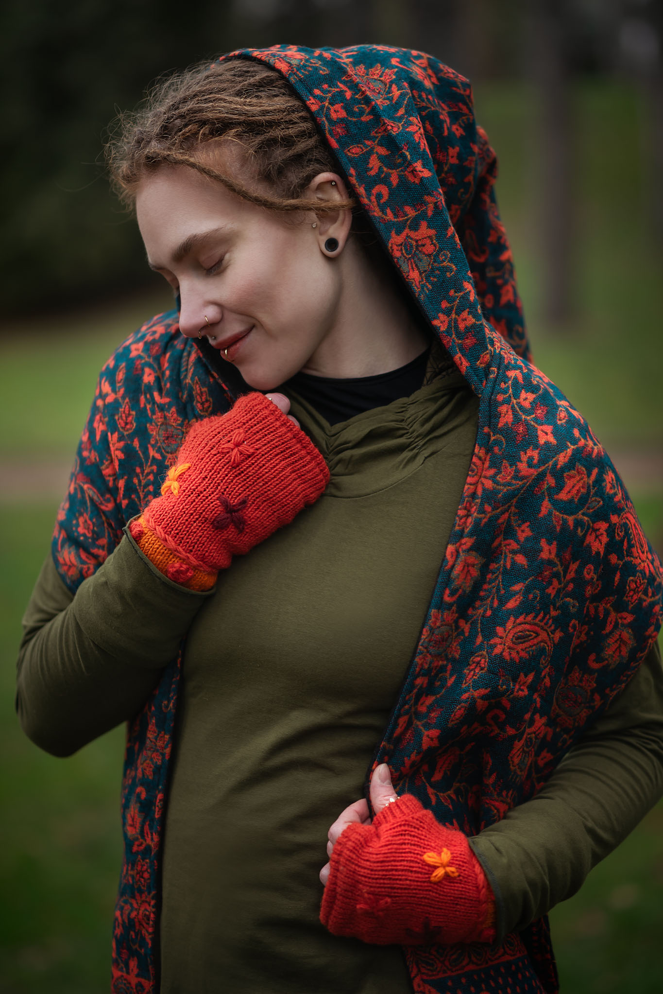 Każde nasz kapturoszal pakujemy w unikatowy, wzorzysty jedwabny woreczek w recyklingu.